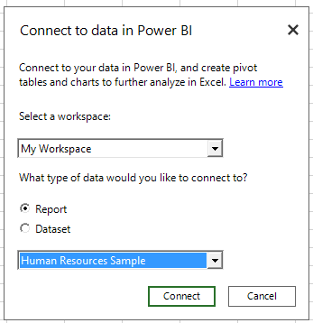 Ensuite, vous devez choisir l’espace de travail à partir duquel vous souhaitez analyser des données. Vous devez également indiquer si vous souhaitez analyser les données d’un rapport ou d’un ensemble de données. Finalement, vous devez choisir le rapport ou l’ensemble de données désiré.