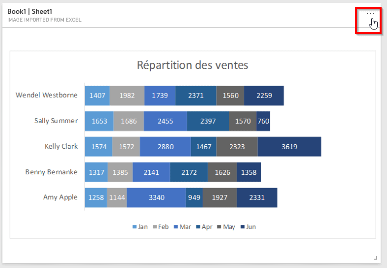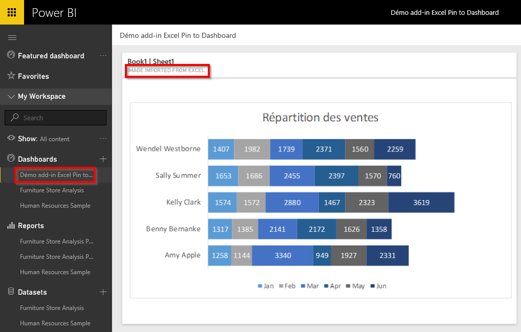 Dans la section Dashboard (Tableaux de bord) de Power BI, dans le tableau de bord sélectionné à l’étape précédente, vous verrez votre sélection apparaître. Notez qu’on y voit la mention Image Imported from Excel (image importée d’Excel). La sélection n’est donc pas dynamique. Elle est simplement présentée en image. C’est d’ailleurs la même chose pour les sélections épinglées dans un tableau de bord Power BI, à partir d’un rapport Excel publié dans Power BI. Voir article Publier vos fichiers Excel dans Power BI.