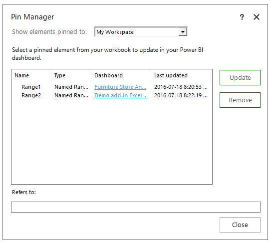 À partir du gestionnaire d’épingles, vous pourrez supprimer des sélections publiées ou mettre à jour les informations de l’image dans Power BI.