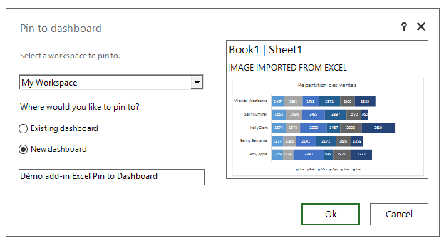 Vous devrez choisir l’espace de travail et le tableau de bord où vous souhaitez épingler votre sélection. Si vous souhaitez épingler votre sélection dans un nouveau tableau de bord, choisissez l’option New Dashboard (Nouveau tableau de bord). Cliquez finalement sur OK.