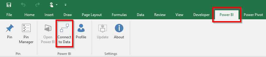 Pour utiliser cette option, il suffit de cliquer sur Connect to Data (Se connecter au données), dans le menu Power BI.