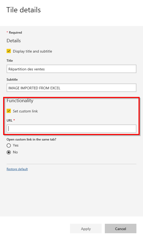 … et de cliquer sur Set custom link (Créer un lien personnalisé) et d’inscrire l’URL du lien en question. Ce faisant, en cliquant sur la tuile en image, vous ouvririez le fichier Excel sous-jacent.