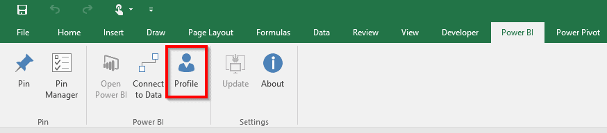 Avant de pouvoir utiliser votre add-in dans Excel, vous devrez vous connecter à votre compte Power BI. Pour cela, cliquez sur l’option Profile (Profil) du menu Power BI.