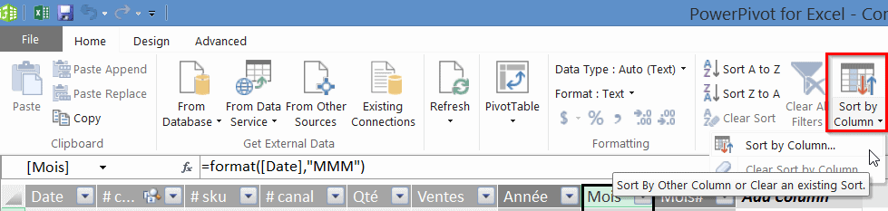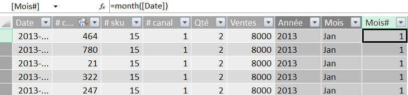 Si vous utilisez les mois comme étiquettes de lignes dans votre tableau croisé dynamique, vous pouvez simplement les trier en ordre chronologique via une liste personnalisée. Par contre, si vous les utilisez dans un segment (slicer), vous devez plutôt modifier votre modèle de données dans Power Pivot. En effet, vous devrez ajouter une colonne représentant le numéro du mois. Vous pouvez le faire à l’aide de la fonction “Month”, tel qu’illustré ci-bas.