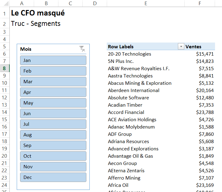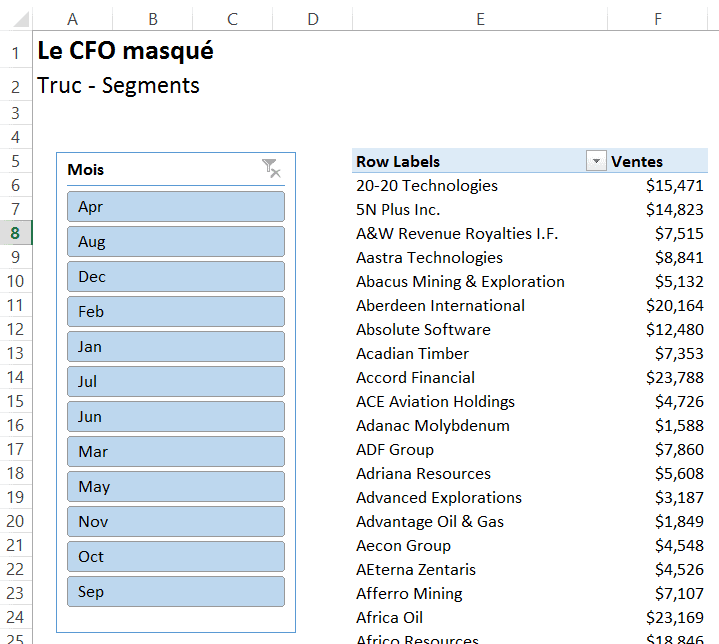 Si vous travaillez avec des segments (slicers) de mois dans Excel à partir d’un modèle de données élaboré dans Power Pivot, vous avez sans doute déjà été confonté à un problème de présentation. En effet, lorsqu’on utilise des segments (slicers) de mois liés à un modèle de données dans Power Pivot, ils apparaissent habituellement en ordre alphabétique. Il existe toutefois quelques façons de contourner ce problème. Cet article vous en présente une, qui est d’une simplicité désarmante.