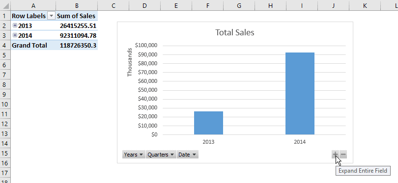 Excel 2013 permet de forer dans un graphique conçu à partir d’un champ représentant une hiérarchie. Je vous ai montré comment dans l’article suivant: Comment et pourquoi créer des hiérarchies dans Power Pivot. Avec Excel 2016, la navigation d’un niveau à un autre se fait de façon plus fluide, à même le graphique, grâce aux nouveaux boutons, que vous pouvez voir en bas du graphique, à droite.
