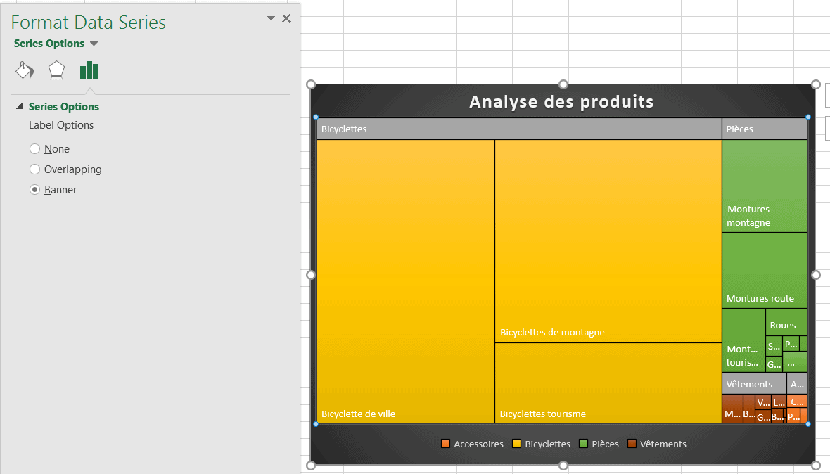 Une des options propres aux graphiques Treemap est celle rattachée aux étiquettes. En effet, il est possible de présenter les étiquettes de données de façon superposée (c’est l’option par défaut), ce qui revient à présenter les titres des catégories principales de la façon illustrée dans l’image ci-dessus. Une autre option est de ne pas présenter les titres de catégories (après tout, ceux-ci apparaissent déjà dans la légende). Et la dernière option est de présenter ces étiquettes dans des bannières à cet effet, tel qu’illustré ci-bas.