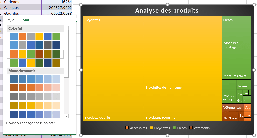 De même, comme il est possible de le faire pour tous les autres types de graphiques, nous pouvons choisir un ensemble de couleurs qui nous convienne.