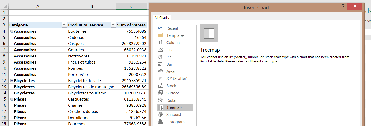 Excel 2016 dispose d’une option de graphique Treemap. Premier élément à noter, c’est qu’un graphique Treemap ne peut pas être créé à partir d’un tableau croisé dynamique, même lorsque celui-ci est présenté sous format tabulaire, tel qu’illustré ci-dessous.
