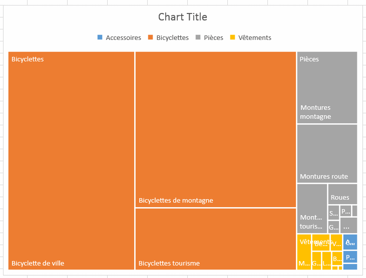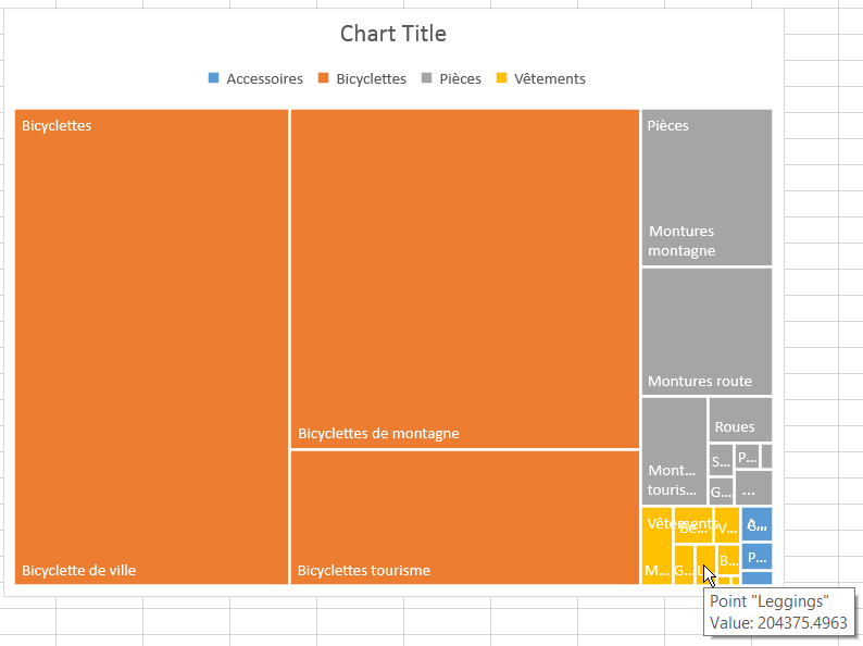 Un des inconvénients rencontrés avec les graphiques Treemap, c’est l’encombrement des titres des séries de données. Moins les données sous-jacentes sont importantes (et plus les titres rattachés à ces données sont longs), plus il est difficile de lire les étiquettes de données. Dans ce cas, il suffit de pointer sur une donnée pour voir ses informations, tel qu’illustré ci-dessous.
