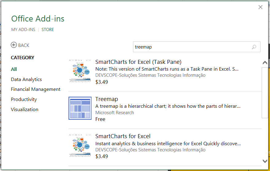 Finalement, Microsoft propose également un add-in pour créer des graphiques Treemap dans le Microsoft Store. Il suffit d’utiliser le moteur de recherche pour trouver le add-in en question. Toutefois, nous l’avons testé et nous sommes d’avis que cet add-in est beaucoup moins convivial que l’option native d’Excel 2016.