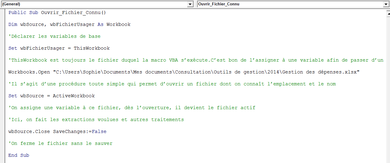 Dim wbSource, wbFichierUsager As Workbook ‘Déclarer les variables de base