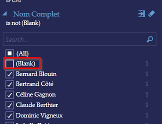 Power View permet aussi de filtrer les résultats obtenus. Par exemple, si vous ne souhaitiez pas voir les ventes non attribuées à un représentant (cellules vides), vous pourriez décocher cet item de la liste des items illustrés.