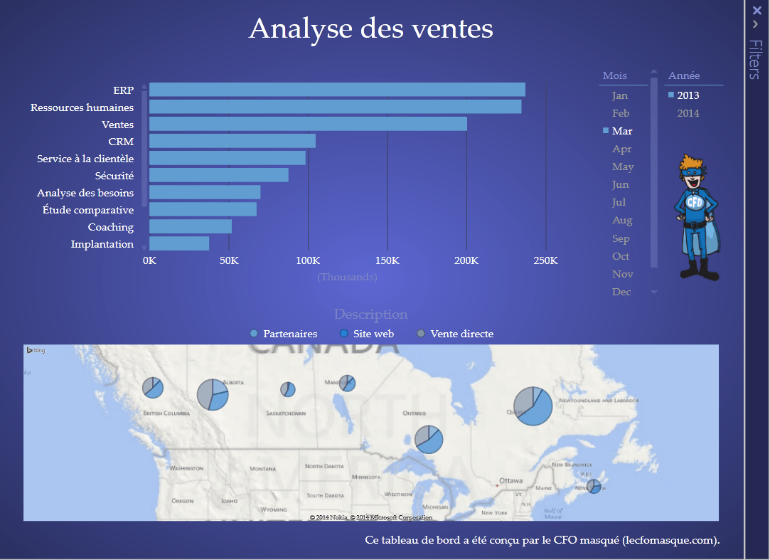 Lorsque vous analysez des données à partir d’un tableau de bord, vous pouvez avoir envie de creuser les données par le biais de différents graphiques. Malheureusement, ceci ne se fait pas dans Excel, à moins d’utiliser de la programmation ou de se contenter des options offertes par les filtres et les segments (les slicers en anglais), apparus en 2010. Par contre, Power View offre différentes façons pour élaborer des pistes de forage dans vos tableaux de bord. Cet article sert à partager avec vous les diverses options pour forer dans Power View vos données à même vos graphiques, à partir de l’exemple ci-bas.