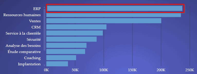 La troisième façon de forer les données dans un graphique élaboré avec Power View est pour moi la plus intéressante. Elle demande toutefois réflexion. C’est à vous de dessiner efficacement la piste de forage que l’utilisateur pourrait vouloir suivre. Lorsque les paramètres ont été fixés, l’utilisateur n’a qu’à double cliquer sur un item du graphique, par exemple, sur les ventes de ERP dans le graphique ci-bas.