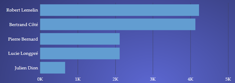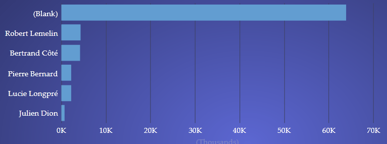 De même, en supposant que le troisième niveau de forage soit les représentants des ventes, l’utilisateur pourra double-cliquer sur une province pour observer les ventes de cette province par représentant. Par exemple, ci-bas, l’utilisateur peut observer les ventes de ERP au Québec par représentant.