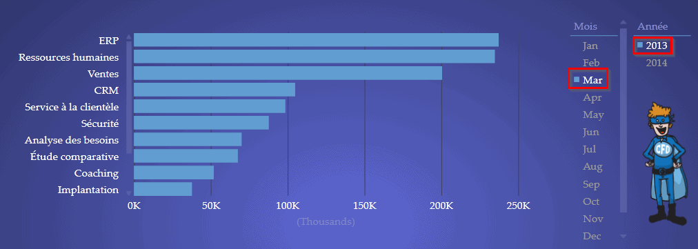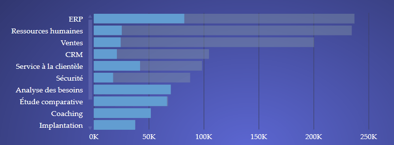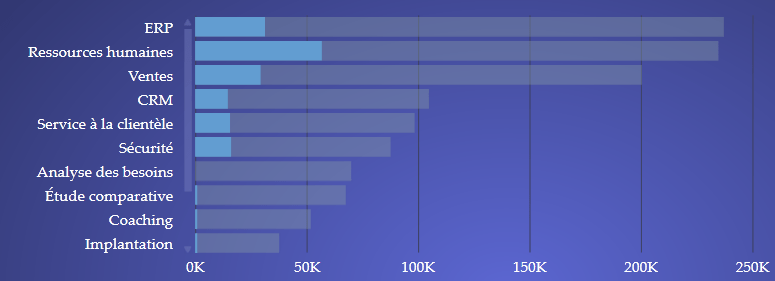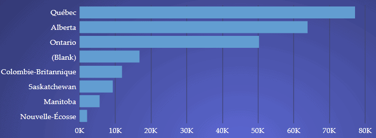 Par la suite, en supposant que le deuxième niveau de forage soit les provinces, l’utilisateur pourra observer les ventes de ERP par province (toujours pour la période de temps sélectionnée).