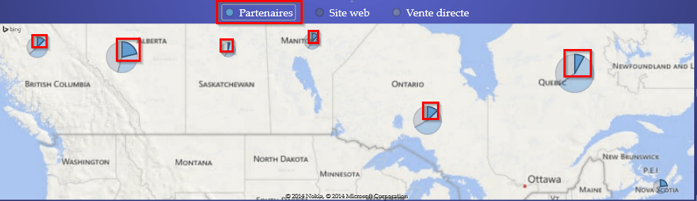 Ensuite, vous pouvez cliquer sur un des éléments de la légende de ce graphique, dans ce cas-ci, les canaux de vente. Par exemple, en cliquant sur “Partenaires”, la pointe de tarte représentant les ventes effectuées par le réseau de partenaires seront mises en évidence, tel qu’illustré ci-bas.