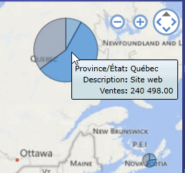 Une autre façon de forer les données dans Power View est par le biais des légendes de graphiques. D’abord, dans notre graphique sous format de map, il faut bien observer que les ventes sont réparties par province, pour la période de temps activée par les segments (slicers) mais aussi que ces ventes sont réparties par canal. Ainsi, chaque tarte présente le chiffre de vente total pour la province, pour la période active, et chaque pointe de tarte représente les ventes du canal correspondant (voir légende). Il suffit de placer le curseur sur une point de tarte pour obtenir l’information sous-jacente. Par exemple, dans l’image ci-bas, on peut observer les ventes du Québec, pour le mois de mars 2013, effectuées par le site web.