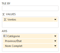 La façon la plus simple de forer les données dans un graphique élaboré à partir de Power View (ou simplement à partir d’Excel 2010 ou 2013) est par le biais de segments (slicers). Par exemple, si l’on souhaite voir les ventes par catégorie, pour une plage de temps différente, dans le graphique ci-haut, on n’aura qu’à utiliser le segment de mois et le segment d’années.