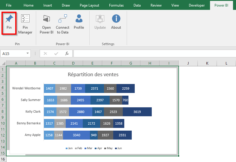 Une fois connecté à votre compte, vous aurez d’abord l’option d’épingler une sélection de votre fichier Excel dans un de vos tableaux de bord dans Power BI. Vous pourrez épingler à peu près tout ce qui peut être créé dans une feuille de calcul: une sélection de cellules, une table, un tableau croisé dynamique, un graphique, une image ou du texte. Ci-dessous, j’ai décidé d’épingler un graphique. À noter que j’aurais simplement pu cliquer sur le graphique pour l’épingler mais j’ai plutôt choisi d’effectuer une sélection de cellules, soit celles qui comprennent le graphique. Le résultat est le même. Cliquez ensuite sur Pin (Épingler).