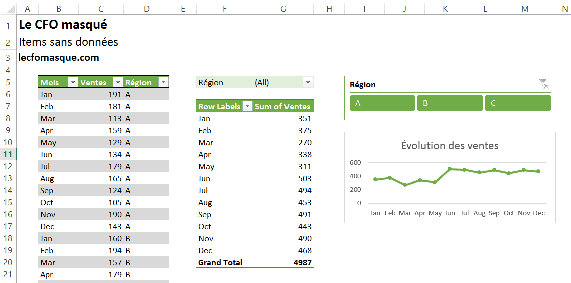 Lorsque vous élaborez un tableau de bord, vous devez toujours penser à produire des graphiques qui seront faciles à comprendre par les usagers. Vous ne voulez pas que l’information soit confuse ou sujette à interprétation. Pour cette raison, il est utile de connaître la fonctionnalité “Afficher les données sans items” dans les tableaux croisés dynamiques. L’article suivant vous explique comment et quand utiliser cette fonctionnalité.