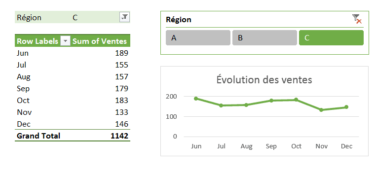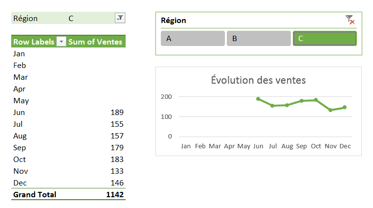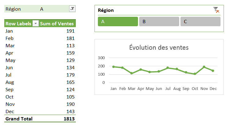 Jusqu’ici, tout va bien. Lorsque l’usager clique sur A, il voit l’évolution des ventes mensuelles de la région A.