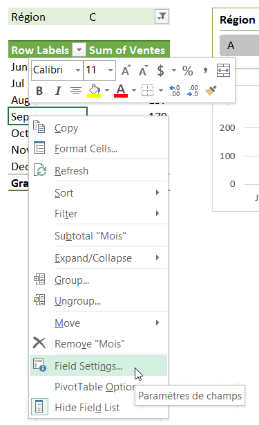 Pour assurer une plus grande cohérence, nous pourrions simplement faire un clic droit de souris sur l’un des mois de notre tableau croisé dynamique et cliquer sur “Paramètres de champs” ou “Field Setting”.