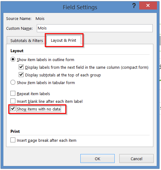 Ensuite, nous pourrions aller dans l’onglet “Disposition et impression” et cocher la case “Afficher les éléments sans données” ou “Show items with non data”.