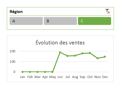 Toutefois, lorsqu’il clique sur la région C, il voit une évolution des ventes mensuelles, mais partielle. En effet, les ventes de la région C ne débutent qu’en juin. Toutefois, en passant d’une région à l’autre, l’usager peut mésinterpréter l’information car les courbes ne sont pas tout à fait comparables.