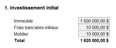 Au delà du coût de l’immeuble, l’investissement inital comprend également des frais bancaires initiaux et des investissements en mobilier, afin de garnir l’immeuble locatif. Voici les informations à cet égard.
