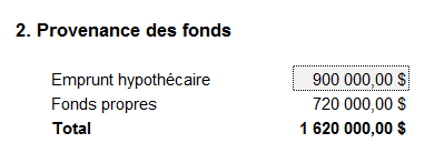 Ce projet est financé en partie par des fonds propres et en partie par emprunt hypothécaire. Cet emprunt hypothécaire est de 900,000$. La balance représente donc les fonds propres.