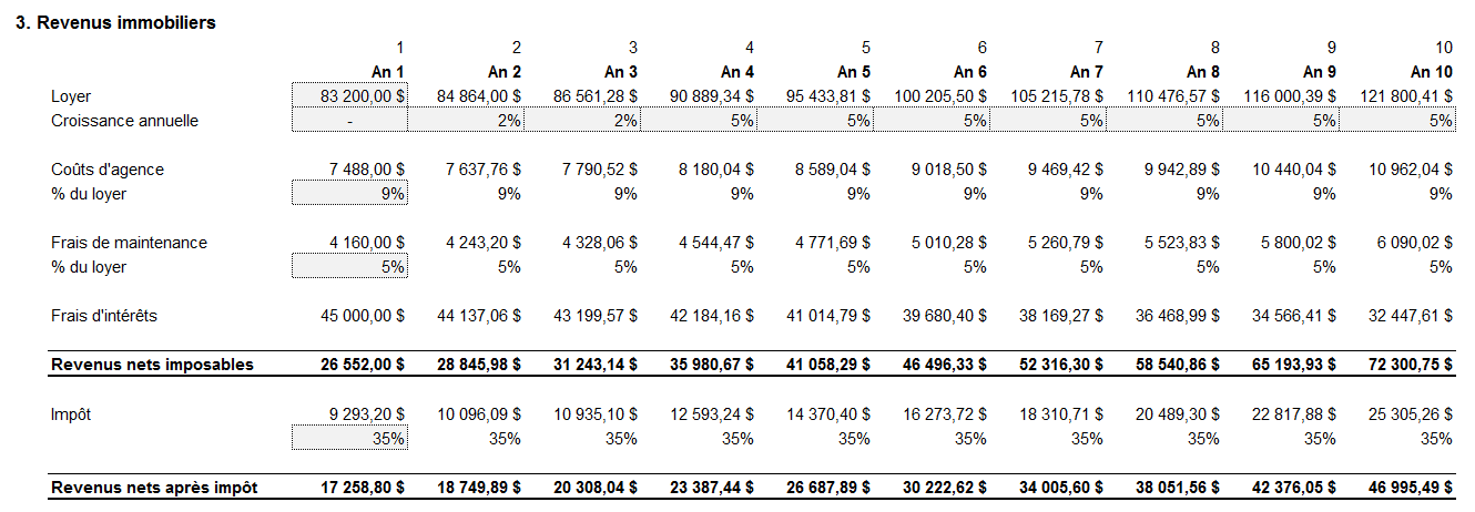 Le loyer initial est de 83,200$ et croît de 2% pour les 2 premières années et de 5% par la suite. Les coûts d’opération de l’immeuble consistent en des coûts d’agence, de l’ordre de 9% des revenus locatifs, de frais de maintenance, de l’ordre de 5% des revenus locatifs et des dépenses d’intérêts (à noter que la dépense d’intérêt est calculée sur le principal, déterminé au point suivant). Tous ces revenus et dépenses sont imposables à 35%.