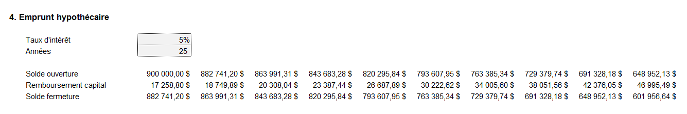 L’ensemble des revenus nets générés par l’immeuble locatif seront utilisés pour rembourser le principal de l’emprunt hypothécaire. On peut donc calculer les soldes d’ouverture et de fermeture de l’emprunt hypothécaire.