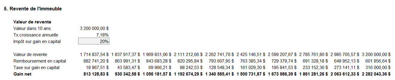 On estime que la valeur de l’immeuble aura doublé dans 10 ans. De plus, on suppose que la croissance se fera à un taux annuel régulier. Pour savoir comment déterminer ce taux, vous pouvez relire l’article Calculer un taux de croissance annuel composé (CAGR). La taxe sur le gain en capital est estimée à 20%. Pour trouver le gain en capital, il suffit de déduire l’investissement initial du montant de la revente.