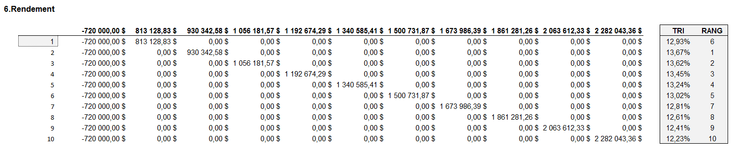Finalement, pour calculer le taux de rendement interne de l’investissement et déterminer pour quelle année, il est le plus élevé, nous pouvons construire une matrice semblable à celle présentée ci-bas, en utilisant les gains nets calculés au point précédent et la fonction TRI (ou IRR en anglais).