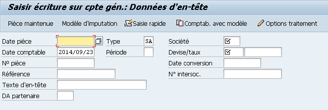 Le premier écran permet de saisir toutes les données d’en-tête de l’écriture. Les champs obligatoires à remplir sont les suivants :