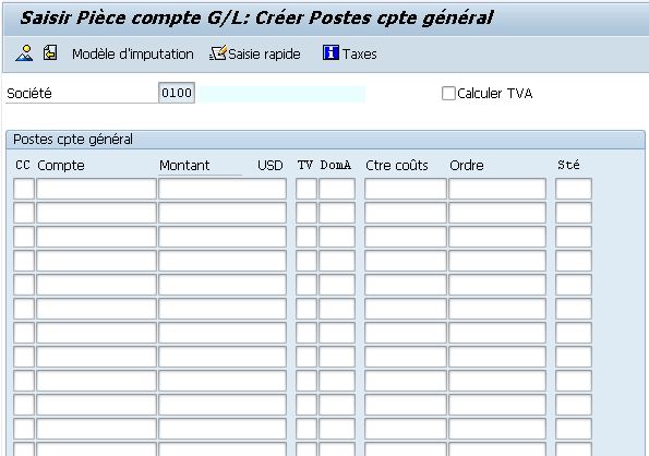 Dans la version de SAP utilisée dans cet article (On‑Premise), la vue Saisie rapide ne permet pas par défaut de saisir le texte de ligne. Toutefois, il est parfois possible de l’ajouter via le paramétrage SAP FI, en modifiant la variante de saisie rapide (transaction O7E6 – Maintain Fast Entry Screens).