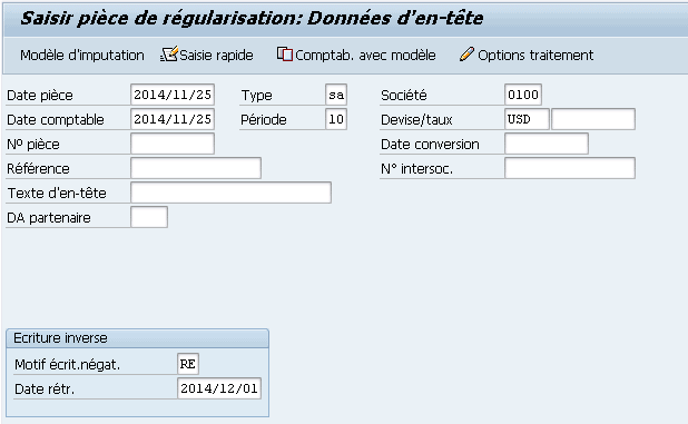 SAP permet de créer des écritures de journal qui se renversent automatiquement à une date donnée. Ce type d’écriture peut être utile pour les écritures de régularisation en fin de mois ou les écritures d’engagement. La transaction SAP à utiliser est FBS1 – Saisir pièce de régularisation.