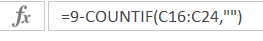 D’abord, nous devons créer une formule qui fournira le nombre d’items dans la liste. La formule suivante pourrait être utilisée. À noter que le 9 est le nombre de lignes qui comprennent la fonction cube qui permet d’aller chercher les items dans le cube. Une formule cube, présentée plus loin dans cet article, pourrait également être utilisée (note: la fonction Countif se traduit par Nb.si en français).
