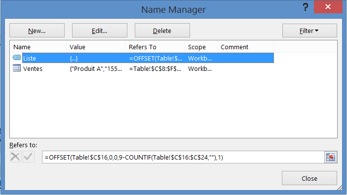 Par la suite, nous devons définir une plage de données (que j’ai nommée Liste dans l’exemple ci-bas), en utilisant la fonction Offset (ou Decaler en français) et en y imbriquant la formule développée ci-haut.