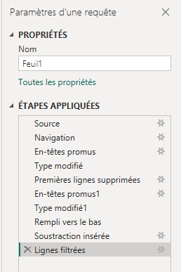 Chacune de ces étapes de transformation est maintenant « enregistrée » dans votre fichier Power BI. Si le fichier Excel source était mis à jour, ces étapes seraient donc ré-appliquées automatiquement. Pour consulter la liste des étapes enregistrées, vous pouvez faire afficher les « paramètres d’une requête ». Chaque étape appliquée correspond à une manipulation que nous avons réalisée précédemment.