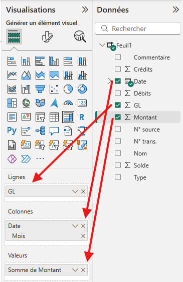 Pour créer votre premier visuel, cliquez sur la « matrice » dans le ruban « Visualisations ». Vous devez ensuite spécifier quelles valeurs seront utilisées pour créer la matrice. Pour reproduire notre exemple initial, nous utiliserons les GL dans les lignes, les dates dans les colonnes et le champ Montant dans Valeurs. Pour remplir ces cases, il suffit de glisser les champs souhaités dans les zones à remplir.