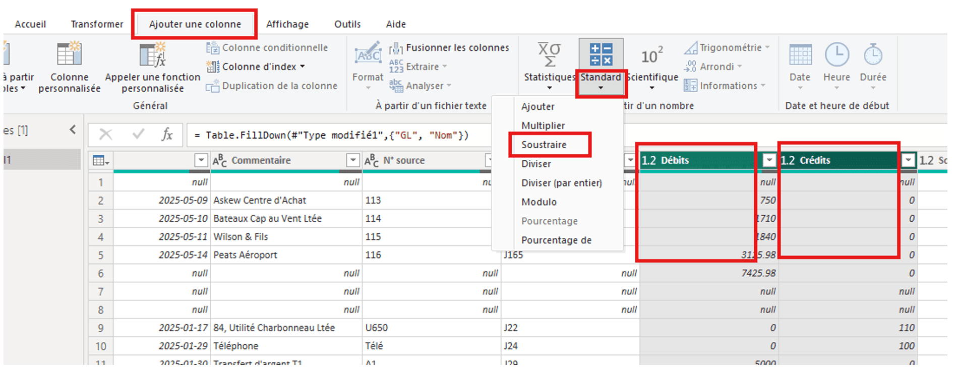 Dans nos données, les débits et les crédits sont présentés en deux colonnes distinctes. Pour pouvoir analyser plus facilement les résultats, j’aimerais créer une colonne qui calcule les débits moins les crédits. Pour y arriver, je sélectionne d’abord la colonne « Débits » puis la colonne « Crédits ». J’utilise ensuite la fonction « Soustraire » qui se trouve dans le menu « Ajouter une colonne » puis « Standard ».
