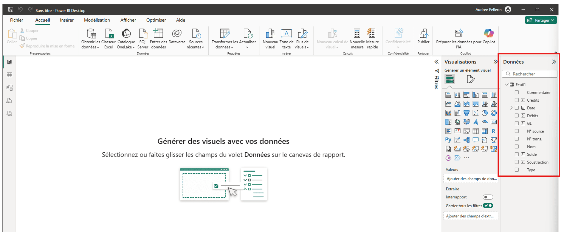 Dans l’interface de rapport de Power BI, vous verrez vos données apparaître dans le ruban « Données » à la droite de l’écran.