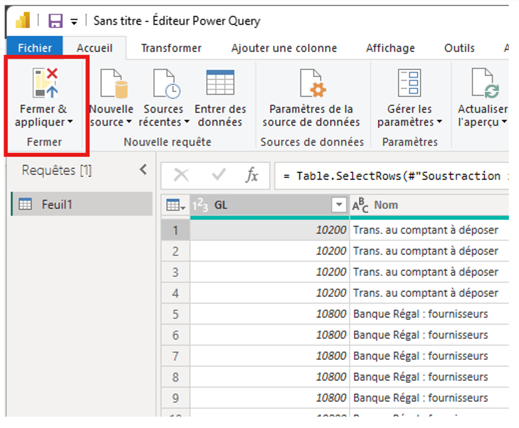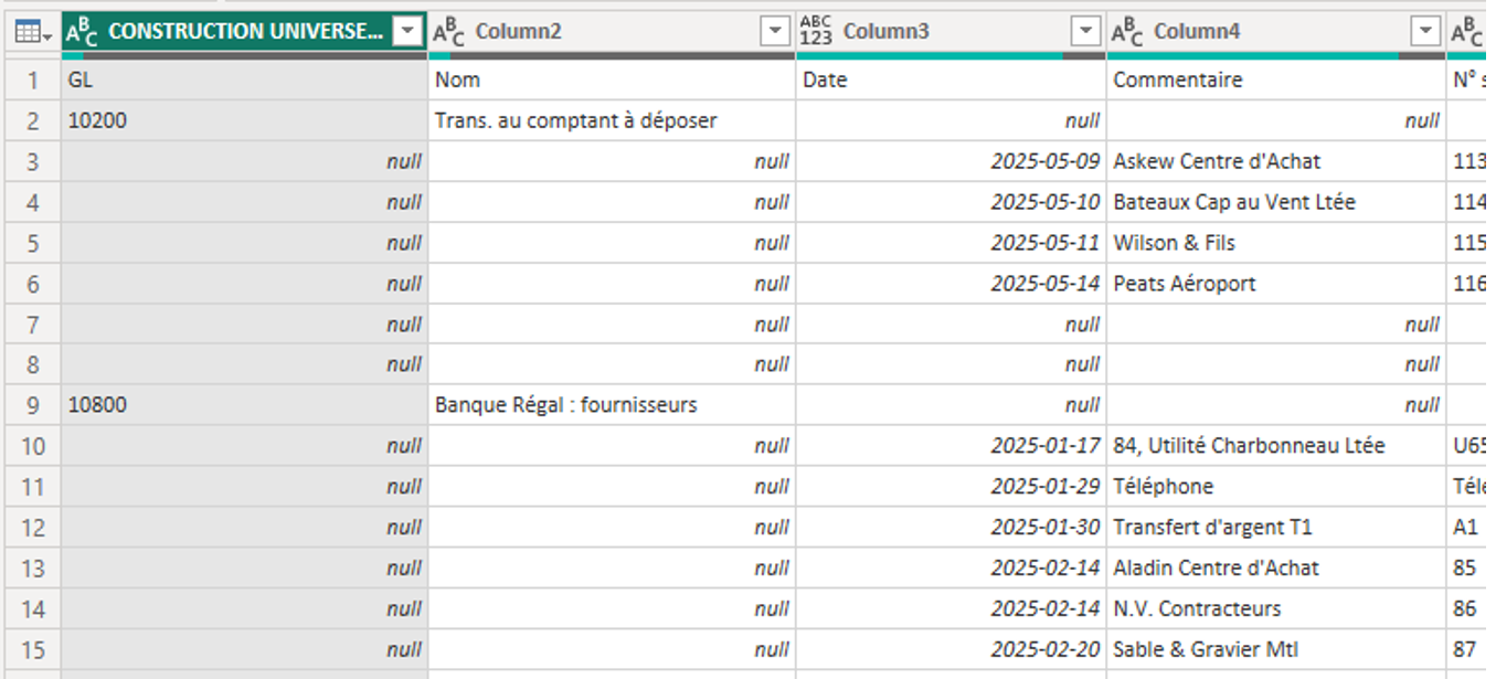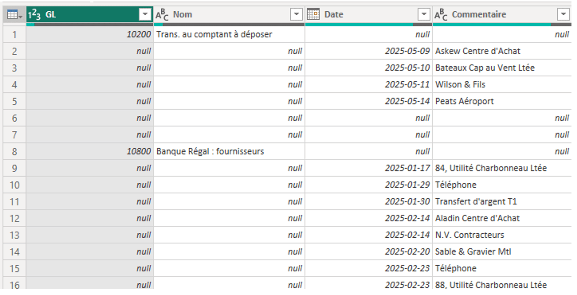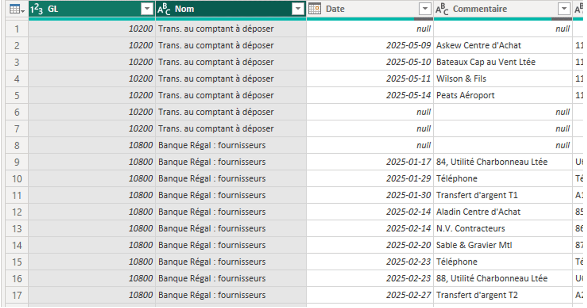 Remarquez que les colonnes GL et Nom sont incomplètes. Pour pouvoir utiliser les données de façon optimale, chaque ligne des colonnes GL et Nom devraient contenir le numéro de GL et le nom approprié. Pour y arriver, nous pourrons utiliser la fonction « Remplir vers le bas » de Power Query. Tel que son nom l’indique, la fonction « Remplir vers le bas » utilisera les valeurs existantes pour remplir les cellules vides jusqu’à ce qu’une nouvelle valeur soit disponible.