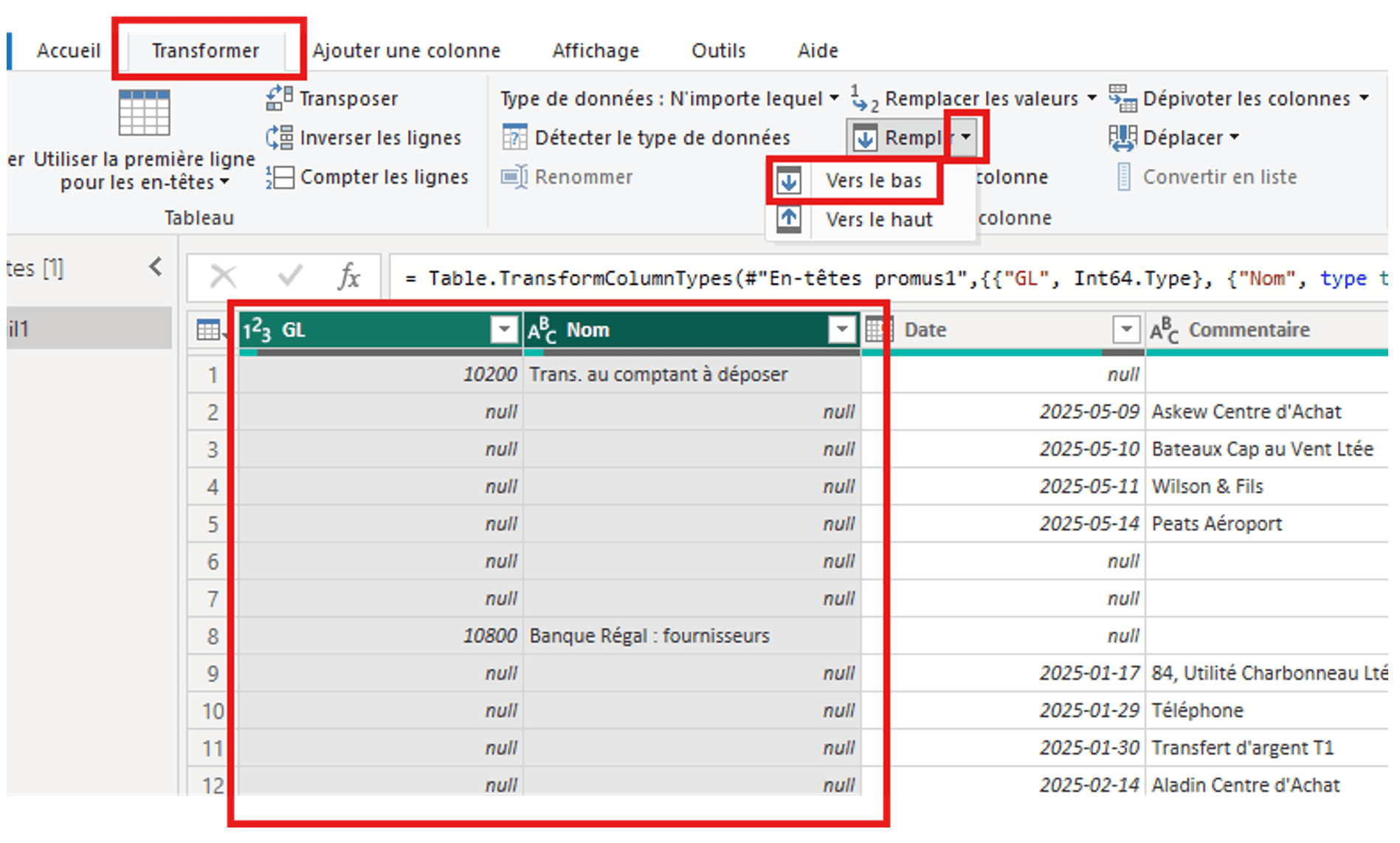 Pour y arriver, sélectionnez les deux colonnes à transformer (« GL » et « Nom »). Dans le menu « Transformer », cliquez sur « Remplir vers le bas ».