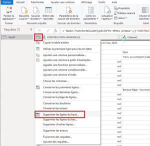 En cliquant sur « Transformer les données », l’interface Power Query s’ouvre et vous permettra d’enregistrer des étapes de transformation.