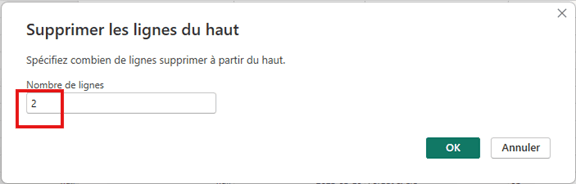 Les 2 premières lignes ne contiennent pas des données utiles à l’analyse. Nous pourrons donc les supprimer. Pour y arriver, cliquez dans le coin supérieur gauche de la feuille et cliquez sur « Supprimer les lignes du haut ». Spécifiez ensuite combien de lignes doivent être supprimées : 2