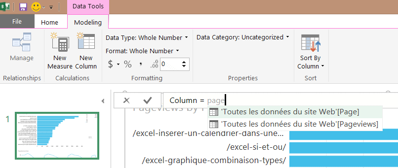 Ensuite, nous avons les options “New Measure” et “New Column”. Nous sommes donc en mesure de créer des colonnes calculées et des mesures avec le DAX, comme dans Power Pivot.